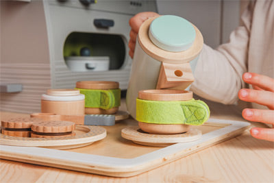 A beautifully detailed wooden coffee and tea set designed for imaginative role play and endless fun! This comprehensive set includes everything needed for a perfect pretend tea party — a large serving tray, cups, saucers, spoons, a coffee/tea pot, sugar bowl, milk jug, and even cookies. Felt details add a realistic touch, while the removable pot and sugar bowl lids make playtime feel authentic. With its soft colours, natural wood tones, and timeless design, this set is both educational and visually delightful.
